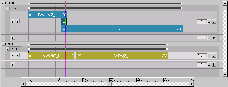 La barre de temps de chaque bipède peut être déplacée ou redimensionnée pour déplacer ou redimensionner l'intégralité du mixage du bipède.