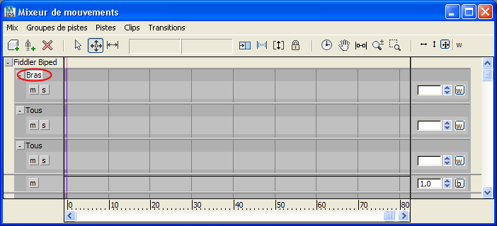 Lors de la création d'un groupe de pistes, une piste de couche lui est affectée par défaut. Cependant, vous pouvez ajouter des pistes supplémentaires à chaque groupe, ce qui rend possible le mixage de mouvements pour chaque ensemble de parties du corps filtrées. Par exemple, vous pouvez créer un groupe de pistes pour les bras et avoir deux pistes de transition dans ce groupe. Vous pouvez ensuite placer deux ensembles de mouvements complètement différents sur chaque piste et utiliser la pondération pour opter pour une piste ou l'autre à différents moments durant le mouvement. Reportez-vous à la rubrique Ajustement du poids d'une piste.