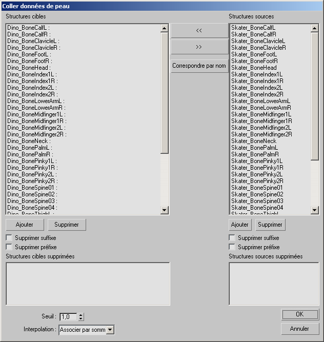 Pour utiliser la boîte de dialogue Coller données de peau, mettez en surbrillance les structures sources et cibles correspondantes et cliquez sur la flèche gauche pour effectuer la correspondance. Seules les structures dotées de correspondances répertoriées sous Structures cibles feront l'objet d'une correspondance lorsque vous cliquerez sur OK.