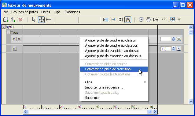 Dans le mixeur de mouvements, le processus de mixage consiste d'abord à ouvrir le mixeur, puis à ajouter des objets à mixer, et enfin à charger des clips de séquence sur des pistes de clips. Une piste de clip est automatiquement créée lorsque vous ouvrez le mixeur après avoir sélectionné un bipède, mais vous aurez probablement besoin d'en créer d'autres pour contenir tous les mouvements à utiliser avec vos objets mixés.
