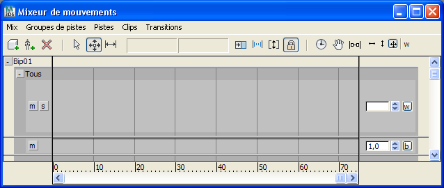 Lorsque vous ouvrez le mixeur, un groupe de pistes, une piste de clip et une piste d'équilibrage sont affectés au bipède sélectionné, le cas échéant. Si l'objet sélectionné est un objet non bipède, le mixeur est vide.