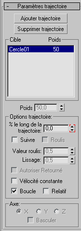 panneau déroulant Paramètres trajectoire. Sur ce panneau déroulant, vous pouvez ajouter ou supprimer des cibles, affecter des poids et animer les valeurs de poids des cibles.