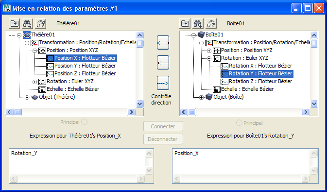 La première fois que vous mettez en relation les paramètres, les expressions par défaut définissent des liens simples de type 1-1 entre les paramètres. Vous pouvez modifier les expressions dans ces fenêtres. Une expression valide génère un résultat du type requis pour le paramètre associé. Par exemple, si vous liez un paramètre indiquant une hauteur (sous la forme d'une valeur à virgule flottante) à un paramètre définissant une position (valeur point3), les expressions doivent inclure des conversions permettant d'obtenir le même type de valeurs en sortie.