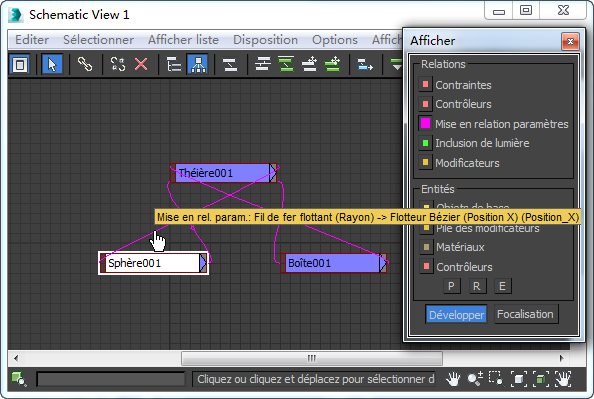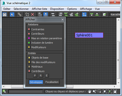 Si des paramètres sont mis en relation au sein d'un noeud de scène (par exemple, la position d'un objet est mise en relation avec le paramètre d'un modificateur appliqué à l'objet), la relation peut ne pas être visible dans la vue schématique. Toutefois, vous pouvez utiliser d'autres options d'affichage afin de rendre ces relations visibles.