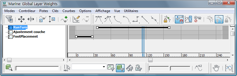 L'intervalle d'une couche est défini par la première et la dernière image clé de n'importe quelle piste de n'importe quelle partie de l'ossature. Si l'intervalle s'étend avant le début ou après de la fin de votre animation, il se peut que l'un des os de l'ossature contienne des images clés indésirables. 3ds Max crée une image clé à l'image 0 dès que vous animez (à l'aide du bouton Clé auto) un objet pour la première fois. C'est de cette façon qu'une image clé indésirable peut être créée.