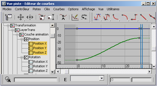 Vous trouverez les clés d'animation du gizmo de transformation dans l'Editeur de courbes, dans la branche Transformation du Parent CAT, sous la couche sélectionnée. Vous pouvez également accéder rapidement aux clés grâce à la fonction Vue intervalles.