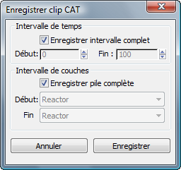 Enregistre une ou plusieurs couches sous forme de clip. Lorsque vous cliquez sur le bouton, une boîte de dialogue de fichier s'ouvre. Vous pouvez y indiquer le nom et l'emplacement du clip ; lorsque vous cliquez sur Enregistrer, la boîte de dialogue Enregistrer clip CAT s'ouvre.
