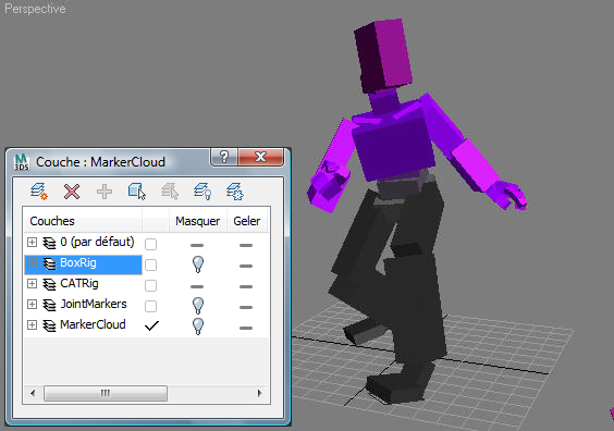 La deuxième couche est la BoxRig qui définit les angles des connexions. Les boîtes sont contraintes à la position des connexions et les contrôleurs Observation définissent les rotations. Notez que la position exacte de la plupart des os n'est pas importante. Par exemple, les articulations des genoux se déplacer par rapport l'os de la hanche. Mais quand ces données sont mappées sur l'Ossature CAT, le système IK de cette dernière nettoie le mouvement et les emplacements des articulations.