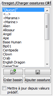 Le panneau déroulant Enregist./Charger ossatures CAT affiche une liste des valeurs ossatures CAT prédéfinies et fournit des commandes permettant de travailler avec des valeurs prédéfinies.