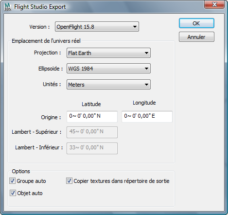 - Si le fichier OpenFlight est exporté vers un autre répertoire et si cette option est activée, toutes les textures sont copiées dans le même répertoire de destination. Lorsqu'elle est désactivée, les textures ne sont pas copiées. Valeur par défaut : activé.