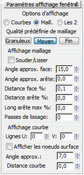 Les paramètres Affichage maillage contrôlent la manière dont l'objet corps est affiché dans la fenêtre. Ces paramètres sont également utilisés lors de la conversion au format maillage/poly éditable pour contrôler la manière dont les polygones sont créés.