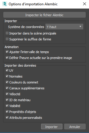 - Permet d'importer une géométrie Alembic dans un système de coordonnées Y-haut ou Z-haut.