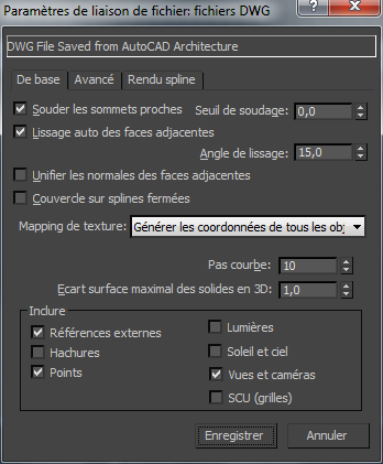Le groupe de fonctions de Base de la boîte de dialogue Paramètres de liaison de fichier : Fichiers DWG définit la manière dont 3ds Max convertit les objets du fichier lié en objets 3ds Max correspondants.