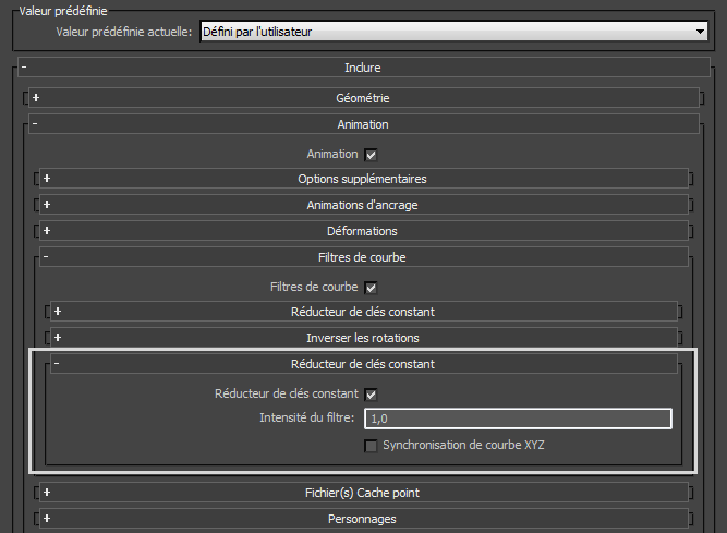 Désactivez cette option pour exporter toutes les clés vers FBX, quelle que soit leur quantité dans l'animation.