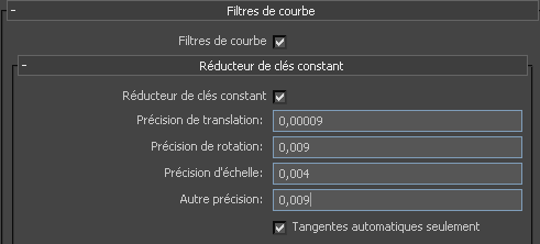 | Tangentes automatiques seulement | Cette option garantit que seuls les types de clé "auto" sont filtrés. Sinon, les clés avec des valeurs d'interpolation supérieures à un certain seuil peuvent être effacées. |