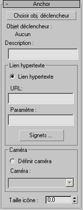 L'assistant Ancrage permet de spécifier un déclencheur de type "cliquer pour exécuter" dans la scène. Ce déclencheur est lié à un objet existant dans la scène. Vous pouvez ainsi créer des liens à d'autres pages HTML ou d'autres univers VRML97, ou encore alterner les caméras dans votre univers VRML97.