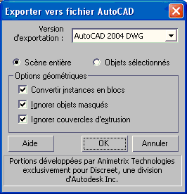 - 3ds Max permet d'exporter vers AutoCAD 2010, AutoCAD 2007, AutoCAD 2004 et AutoCAD 2000.