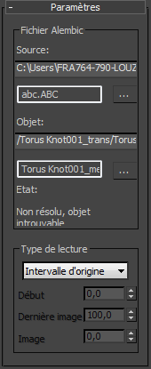 Dans 3ds Max, chaque objet importé à partir d'un fichier Alembic ABC Alembic s'affiche sous la forme d'un objet Alembic. Les objets Alembic animés possèdent des contrôleurs AlembicXform.