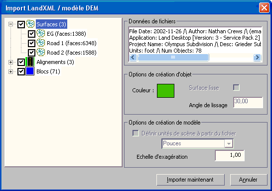Dans le générateur LandXML/ modèle DEM, vous déterminez les parties des données de développement des terrains qui sont importés vers 3ds Max. 3ds Max crée alors des objets séparés pour chaque fonctionnalité de terrain, y compris les surfaces du terrain, les axes de routes et les blocs.