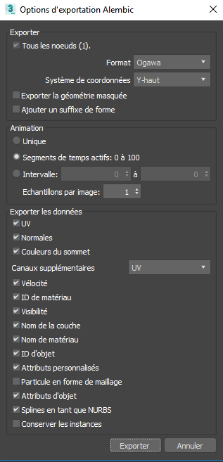 Lors de l'exportation d'un fichier Alembic, vous exportez automatiquement des données pour les éléments suivants :