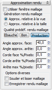 Choisissez un paramètre global qui détermine automatiquement les autres paramètres Approximation rendu.  Le choix par défaut, Production, fournit la plupart du temps une qualité de rendu élevée sans artefacts polygonaux. Il est parfois nécessaire d'effectuer des réglages supplémentaires.