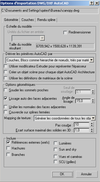Cette zone contient des options permettant de convertir la géométrie du fichier DWG ou DXF au format 3ds Max.