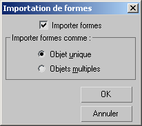 Lorsque vous importez un fichier SHP, la boîte de dialogue Importation 3DS s'affiche. Il s'agit de la même boîte de dialogue que pour l'importation de fichiers 3ds. Spécifiez les options voulues et cliquez sur OK pour fermer cette boîte de dialogue. La boîte de dialogue Importation de formes s'affiche.