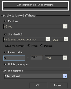 Le plug-in détermine les unités par défaut en se reportant à l'échelle des unités système dans la boîte de dialogue Configuration des unités système de 3ds Max. Pour plus d'informations sur les problèmes de mise à l'échelle incorrecte ou non souhaitée, voir Pourquoi ma scène est-elle à une échelle différente dans 3ds Max ?