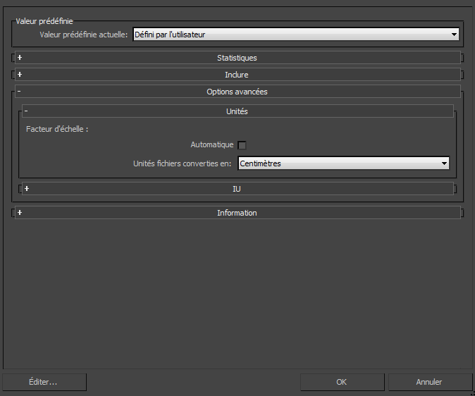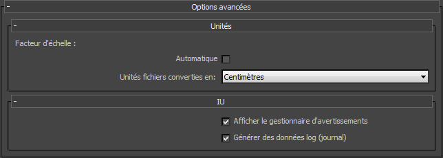 Cette option est toujours active, mais si les unités de votre fichier correspondent aux unités système, le plug-in n'a pas besoin d'appliquer une conversion d'échelle. Le plug-in n'applique aucune conversion. Le facteur d'échelle affiché dans ce cas est 1.0. Vous pouvez augmenter la vitesse d'importation ainsi que les performances lorsque vos unités concordent, notamment dans les procédures Revit vers 3ds Max.