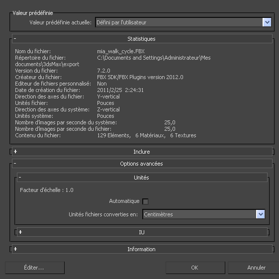 Le 3ds Max FBX plug-in stocke les fichiers journaux avec les valeurs prédéfinies FBX, dans C:\Mes Documents\3dsmax\FBX\Logs.
