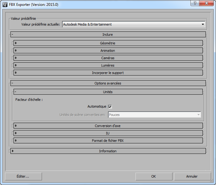 Activez l'option Automatique si vous souhaitez que le 3ds Max FBX plug-in identifie, définisse et convertisse automatiquement les unités du fichier entrant afin qu'elles correspondent aux unités de l'application hôte.