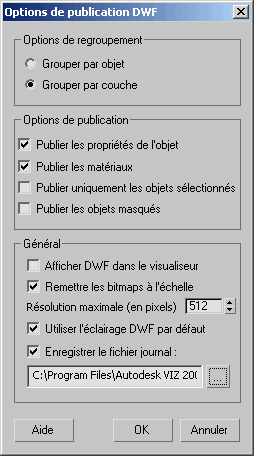 - Lorsque cette option est activée, 3ds Max crée un fichier texte portant l'extension .log qui répertorie les objets, leurs couches, le nombre de faces et de sommets exportés ainsi que l'heure et la date de l'exportation. Les objets non sélectionnés ou masqués sont également répertoriés comme ne faisant pas partie de l'exportation. Le fichier journal est remplacé chaque fois qu'un fichier DWF est créé, à moins que le nom du fichier journal ou son emplacement ait changé. Cette option est activée par défaut.