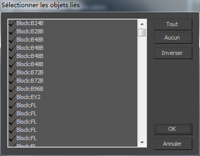 La boîte de dialogue Sélectionner les objets liés affiche les objets liés associés au fichier lié sélectionné, y compris les blocs VIZBlock, les lumières et les caméras. Elle permet, lors du rechargement d'un fichier lié, d'inclure ou d'exclure certains objets. Cette fonction peut s'avérer utile pour recharger uniquement les objets qui ont été modifiés.