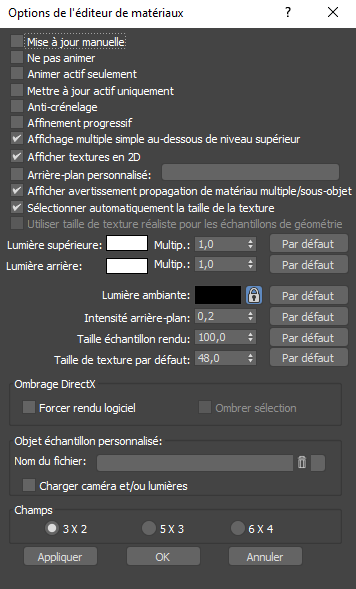 - Applique les paramètres courants, à l'exception des modifications apportées à la zone Champs, sans quitter la boîte de dialogue Options de l'éditeur de matériaux. Cette option est utile lors du réglage de l'éclairage des champs échantillons.