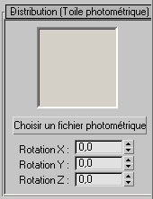 Le panneau déroulant Distribution (fichier photométrique) apparaît dans le groupe de fonctions Modifier lorsque vous créez ou sélectionnez une lumière photométrique avec une distribution de toile photométrique. Ces paramètres vous permettent de sélectionner un fichier toile photométrique et d'ajuster l'orientation de la toile.