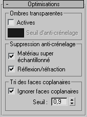 Le panneau déroulant Optimisations inclut des commandes supplémentaires pour la création des ombres par lancer de rayons avancé et des ombres douces.