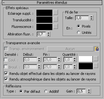 Le panneau déroulant Paramètres étendus d'un matériau Lancer de rayons contrôle les effets spéciaux, les propriétés de transparence et les paramètres de réflexivité avancés du matériau.