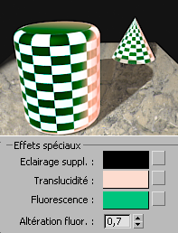 Lorsque le paramètre Altération fluor. est égal à 0,5, la composante Fluorescence se comporte comme une couleur diffuse. Une valeur supérieure à 0,5 augmente l'effet fluorescent, et l'objet concerné brille plus que les autres. Une valeur inférieure à 0,5 rend l'objet moins brillant que les autres objets de la scène. Ceci permet d'obtenir quelques effets de déplacement chromatique.
