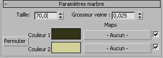 La map Marbre génère une surface marbrée avec des veines colorées sur un arrière-plan de couleur. Une troisième couleur est générée automatiquement.