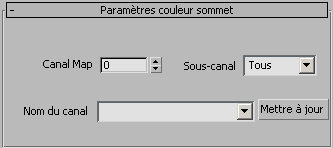 Après avoir affecté le matériau et la map Couleur sommet à un objet avec une map nommée ou des canaux couleur sommet (reportez-vous à la rubrique Utilitaire Infos canal), cliquez sur Mettre à jour, puis sélectionnez dans la liste déroulante un canal map nommé de l'objet.