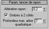 Définit la profondeur de l'arbre quadratique utilisé par le lancer de rayons. Une profondeur supérieure de l'arbre quadratique peut améliorer le temps de lancement de rayon mais utilise beaucoup de mémoire. Néanmoins, il existe une profondeur où l'amélioration des performances est compensée par le temps nécessaire pour générer l'arbre quadratique lui-même. Tout dépend de la géométrie de la scène. Valeur par défaut : 7.