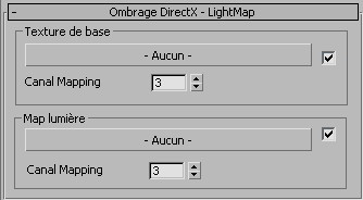 Ce panneau déroulant apparaît lorsque vous sélectionnez LightMap comme ombrage fenêtre DirectX. L'ombrage TextureLumière peut afficher simultanément une texture de base et une map d'éclairage. Ces deux maps sont généralement issues de l'utilisation de la fonction Rendu en texture (ancrage de textures). La texture de base étant habituellement une map complète, une map de fusion ou une map diffuse. Vous pouvez utiliser ces types de maps ainsi que les maps d'éclairage comme éléments d'une texture ancrée.