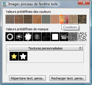 La boîte de dialogue comporte une ligne de pinceaux de couleur prédéfinis, une ligne d'images Masque prédéfinies, la liste des textures personnalisées vous permettant d'utiliser vos propres images comme textures et deux boutons de gestion des textures. Pour afficher le nom de chaque image Pinceau, placez le curseur de la souris sur sa vignette.