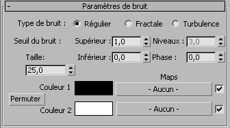 Permet de sélectionner les bitmaps ou les maps procédurales qui apparaissent dans l'une des deux couleurs de bruit.