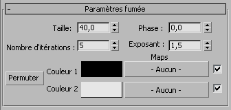 Fumée est une map 3D qui génère des motifs de turbulence amorphes fondés sur un algorithme fractal. Ils sont principalement conçus pour être utilisés comme maps d'opacité animées afin de simuler des volutes de fumée dans un faisceau lumineux ou d'autres effets brumeux mouvants.
