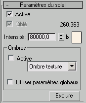 Les objets exclus apparaissent néanmoins éclairés dans les fenêtres ombrées. L’exclusion prend effet uniquement lors du rendu de la scène.