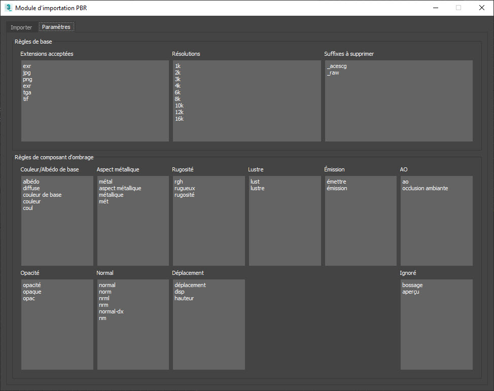- Si le suffixe correspond à ce qui est spécifié (après suppression des suffixes éventuels), il est traité comme une texture de déplacement.
