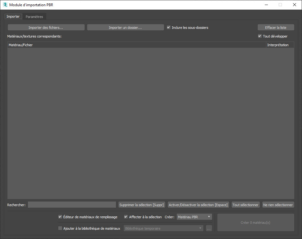 - Si vous utilisez l’éditeur de matériaux détaillé, une vue Module d’importation PBR est créée et remplie avec les matériaux.