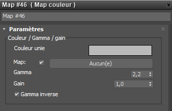 - Lorsque cette option est désactivée, la map multiplie l'entrée par la valeur gain, puis applique une correction gamma à la couleur. Lorsqu'elle est activée, la map applique une correction de gamma inverse à la couleur, puis la divise par le gain.
