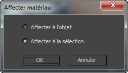 Si l'objet n'est pas sélectionné ou s'il s'agit du seul objet sélectionné dans la scène, le matériau est appliqué immédiatement. Si l'objet fait partie d'une sélection de divers objets dans la scène, 3ds Max vous invite à choisir entre l'affectation du matériau à cet objet uniquement ou à l'ensemble de la sélection (ce dernier choix étant le choix par défaut).